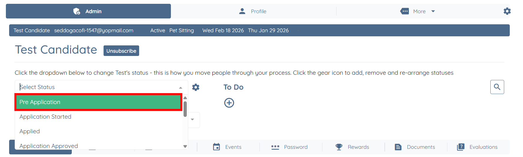 Step 4: Select the status you want to update for the selected candidate, such as Pre Application.