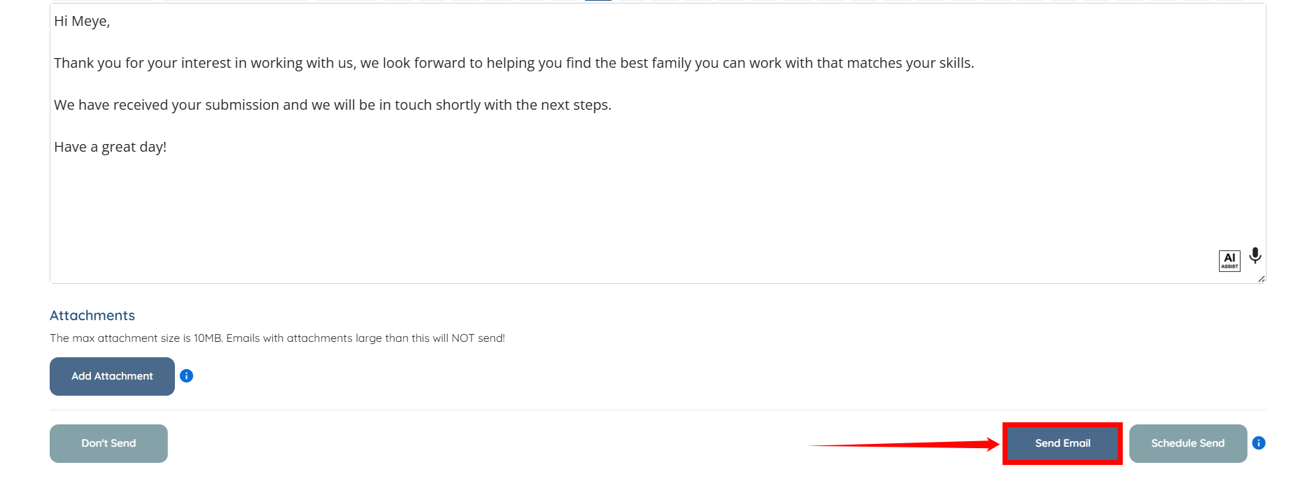 Step 4: Click the Send Email button to send an email to the new candidate.