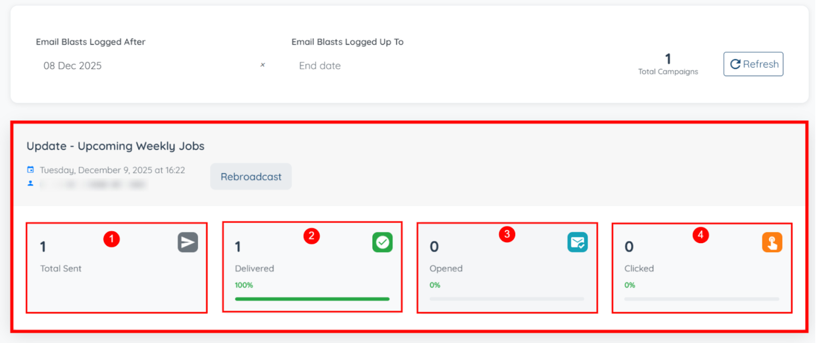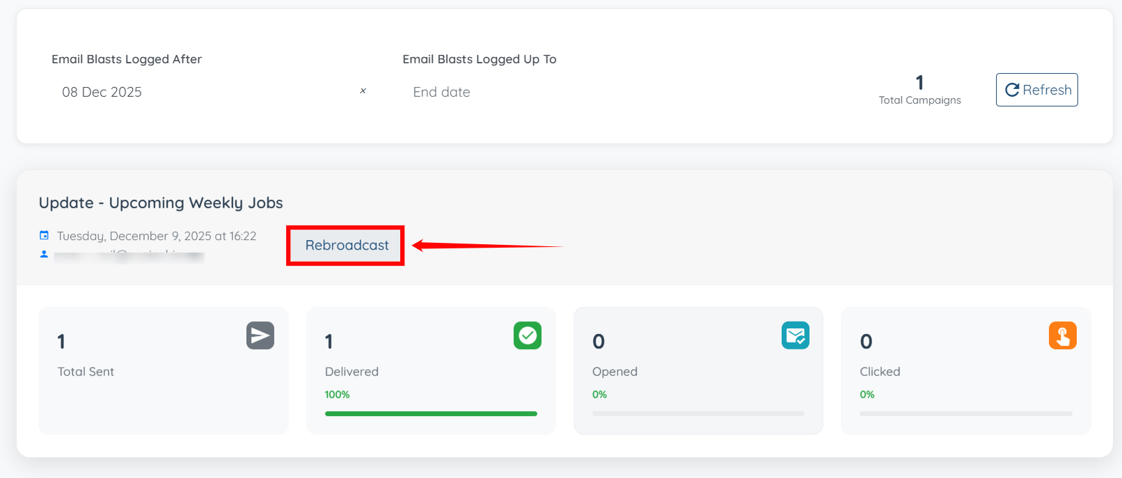 Step 5: You can also click the Rebroadcast button to rebroadcast the same email again.