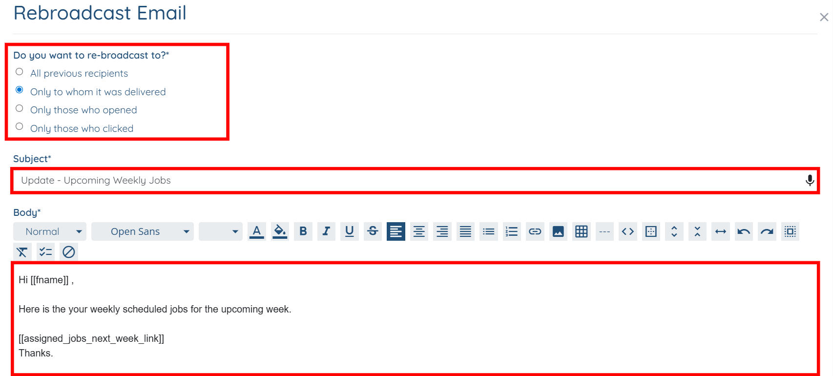 Step 6: Select the recipients to whom you want to rebroadcast the email, and you may also modify the email’s Subject and Body if you choose to do so.