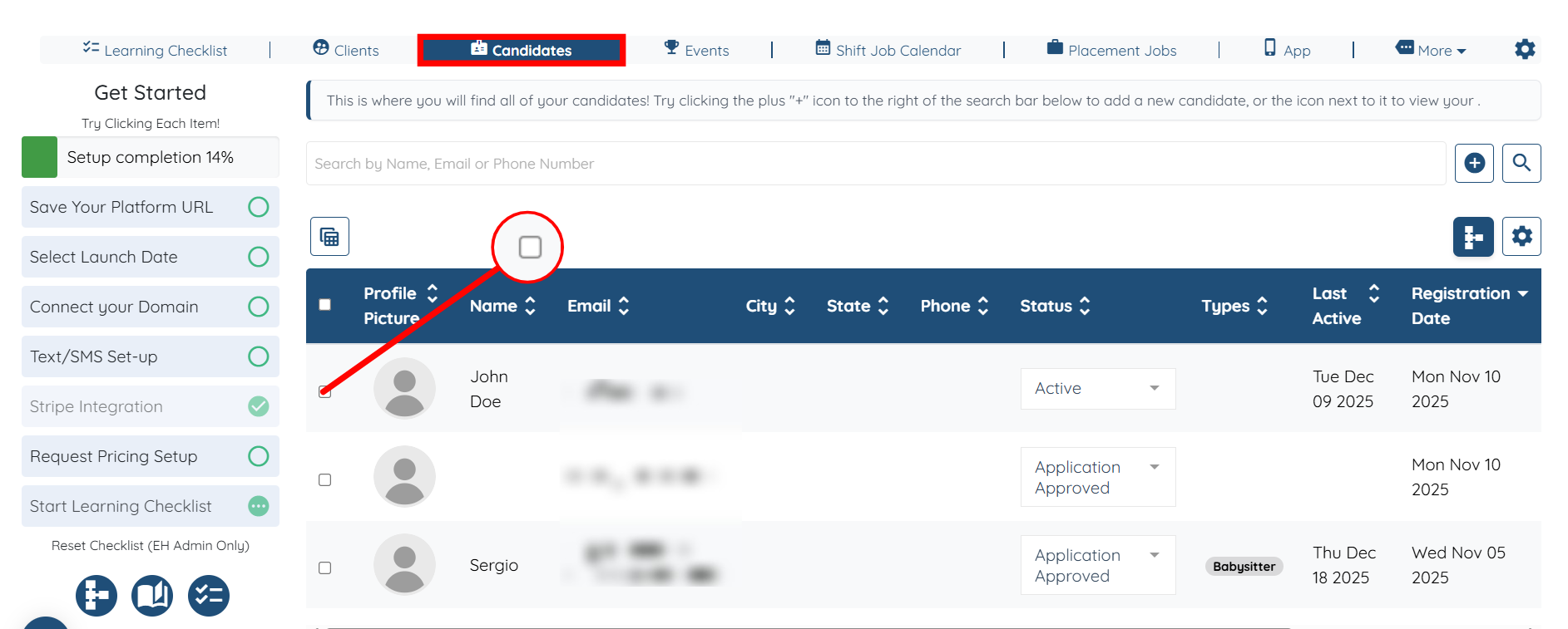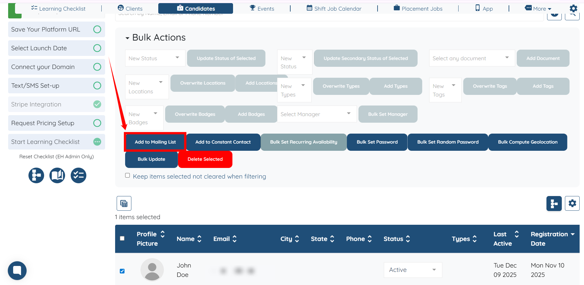 Step 1: Under Candidates on your agent dashboard, click the checkbox located just before the candidate’s name for the candidate you want to add to the mailing list.