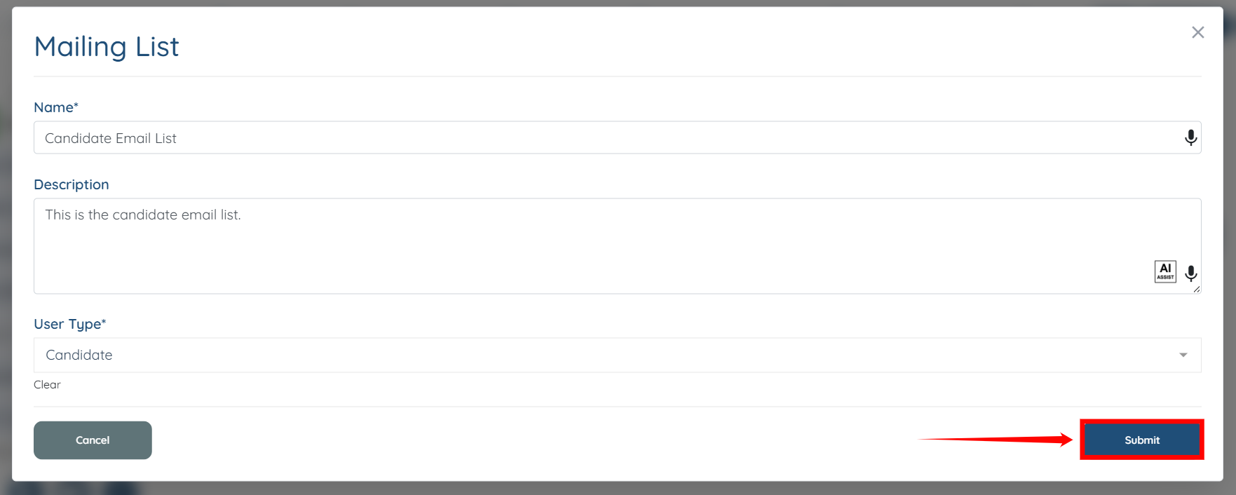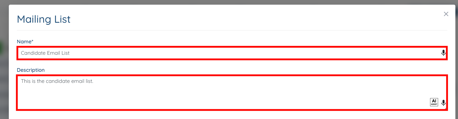 Step 3: Enter the Name and Description for the mailing list.