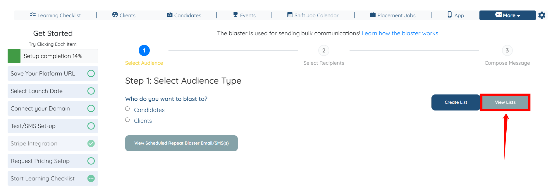 Step 5: Now, under the Email/SMS/Push Notification Blaster option, click the View Lists button.
