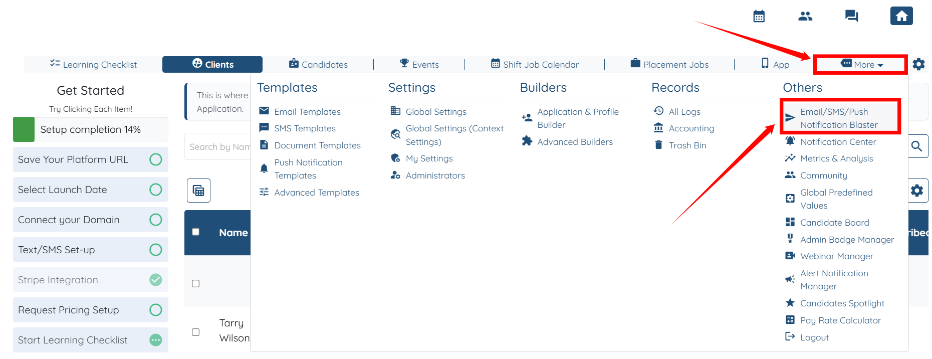 Step 1: Log in to your agent dashboard and click More > Email/SMS/Push Notification Blaster, as shown in the screenshot below.