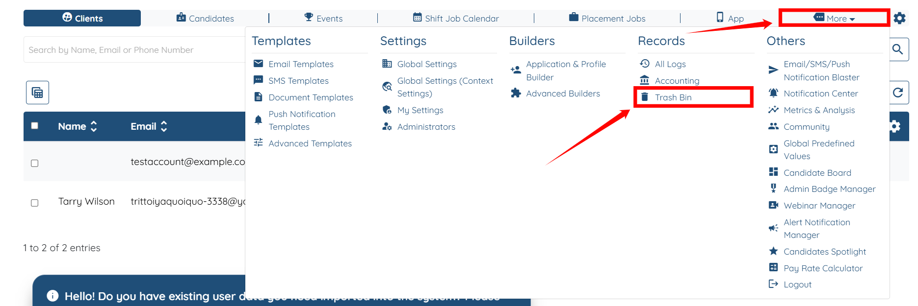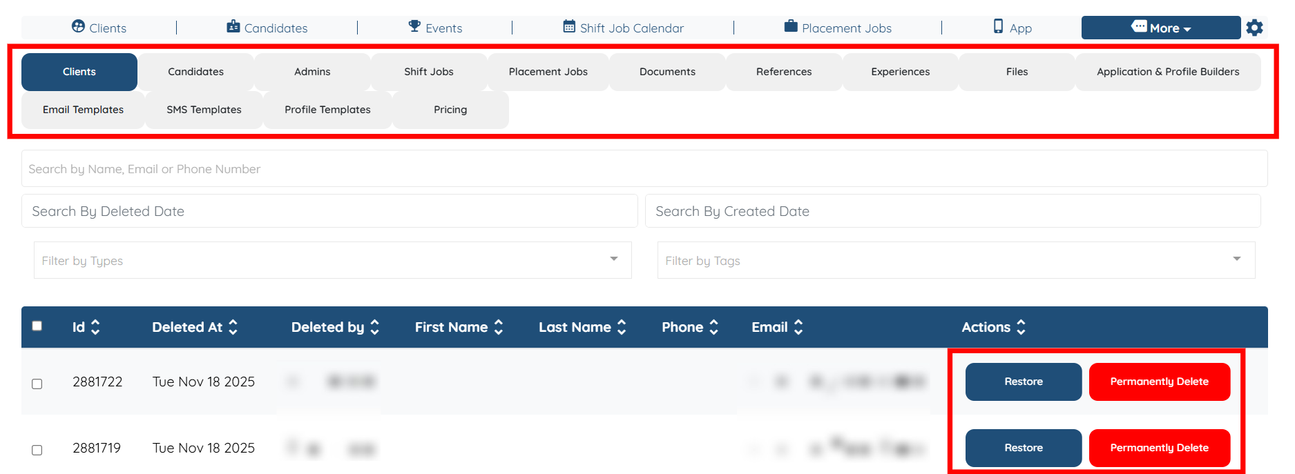 2. View any deleted information from the categories of Clients, Candidates, Admins, Shift Jobs, Placement Jobs, Documents, Files, or Applications and Profile Builders.
