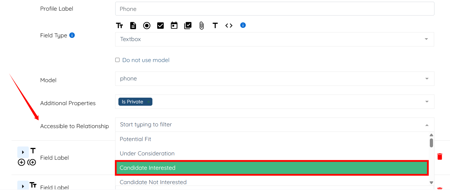 Step 4: In the Accessible to Relationship field, select the relationship status, under which the client can view the question. For example, Candidate Interested.