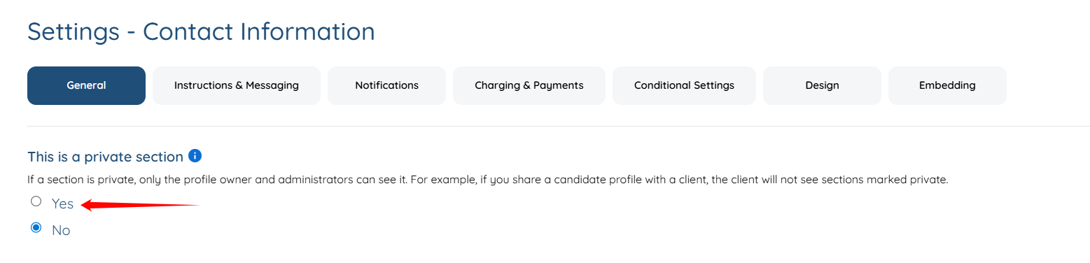 Step 6: Click the Yes radio button under the “This is a private section“ field.