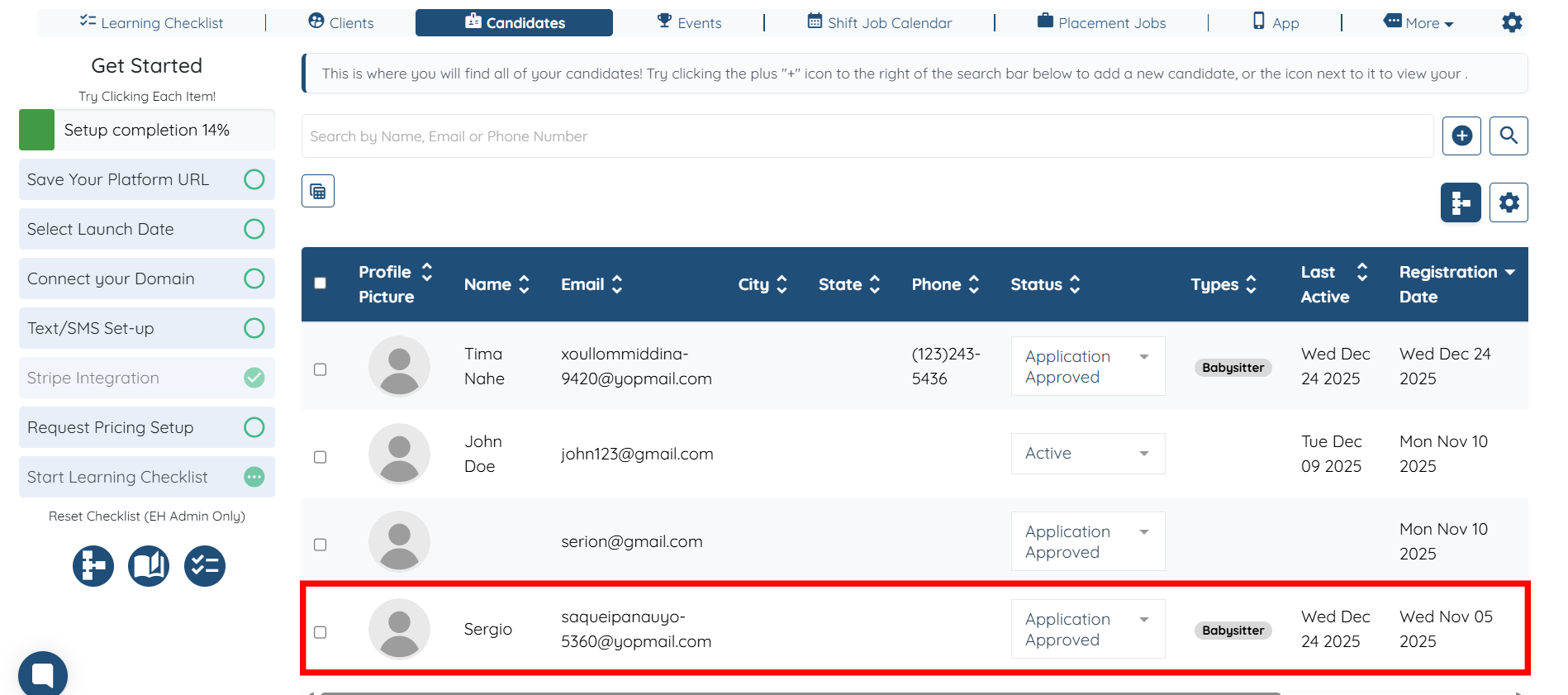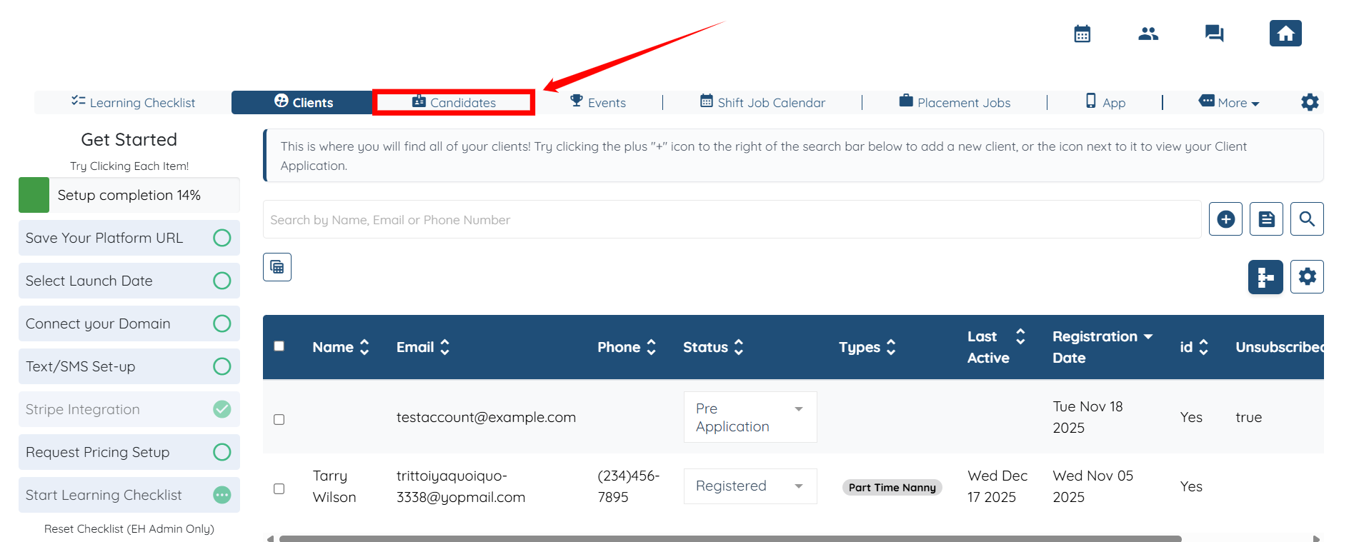 Step 1: Log in to your agent dashboard, then click Candidates in the top navigation bar.