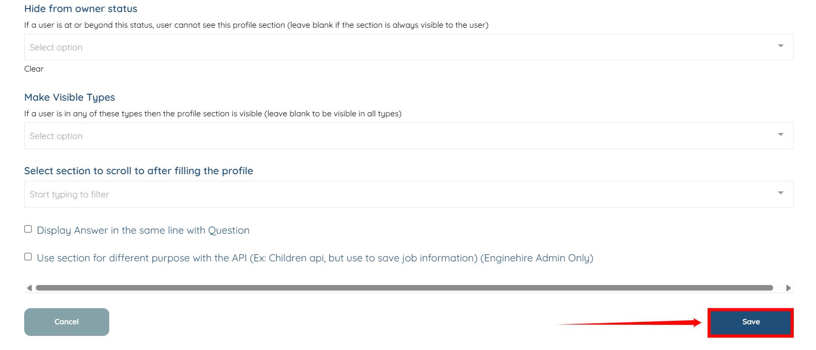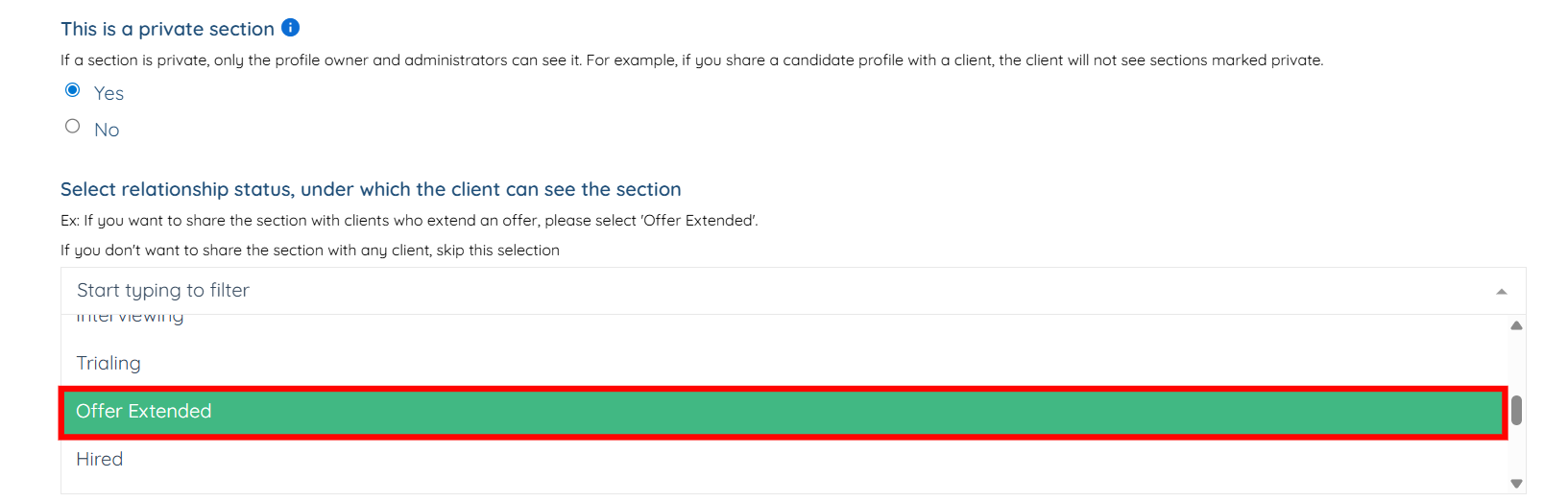 Step 7: Select the relationship status under which the client can view the section. For example, if you want to share the section with clients who have extended an offer, you can select “Offer Extended.”
