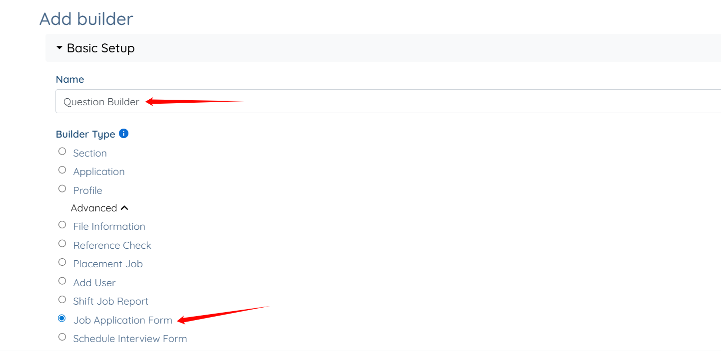 Step 3: Enter a name for your builder, and then select the Job Application Form option as the Builder Type.