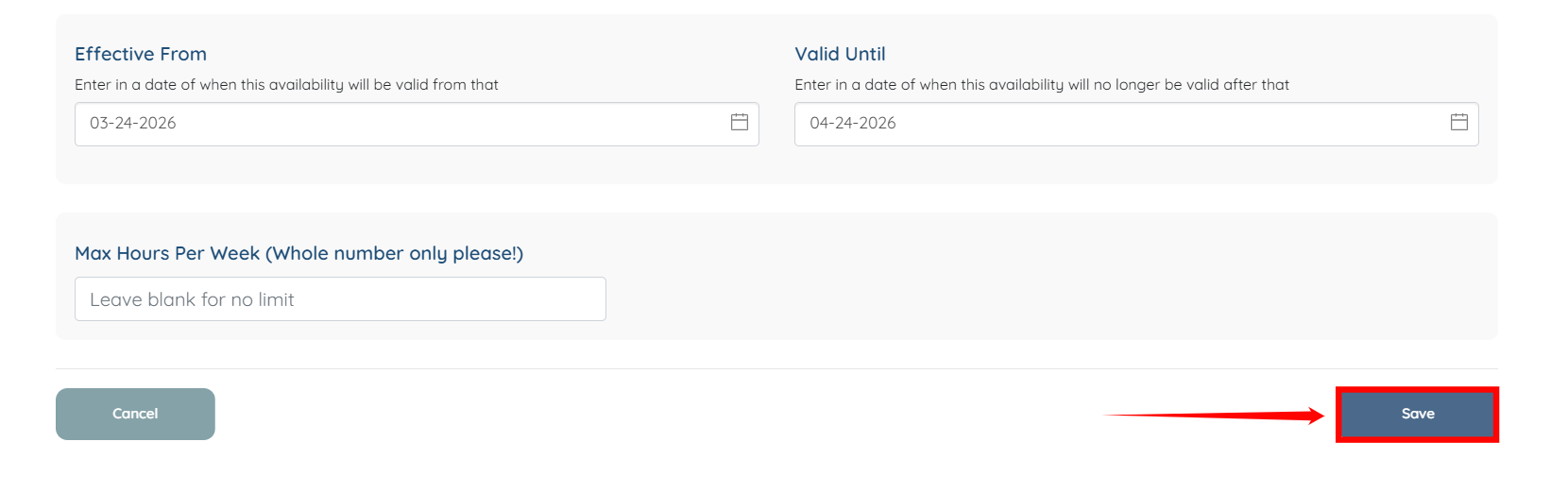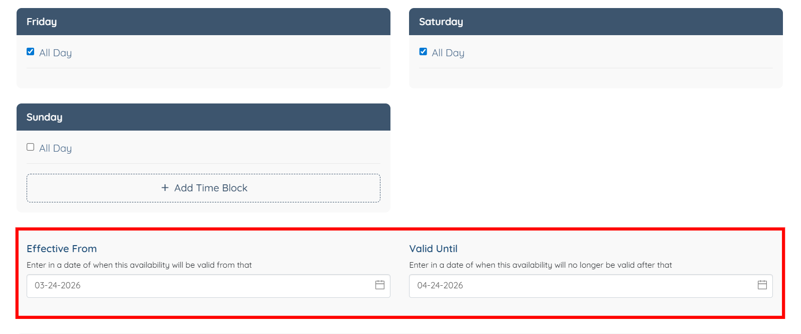 Step 7: After you enter your complete availability, enter the start date and end date for which the availability should apply.