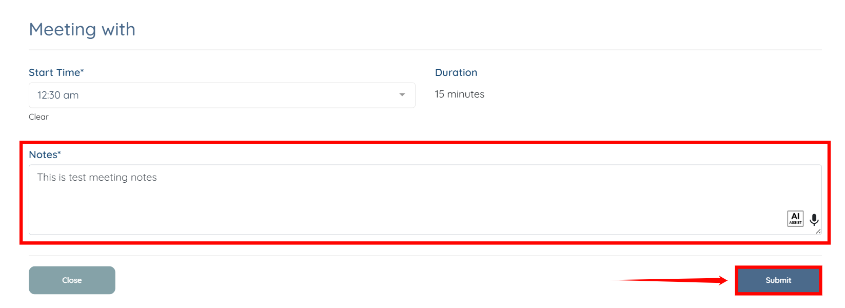 Step 3: Enter the meeting notes, and then click the Submit button to submit the request.