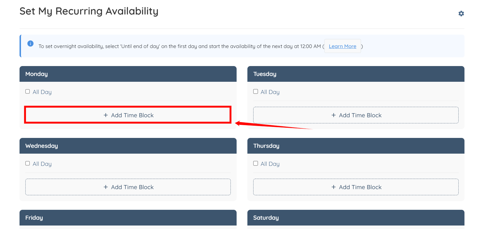 Step 5: Click Add Time Block within a day to define availability.