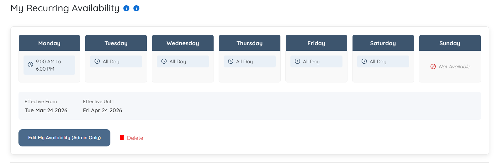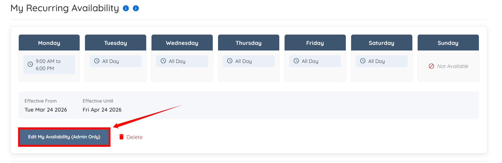 You can edit your availability at any time by clicking the Edit My Availability (Admin Only) button.