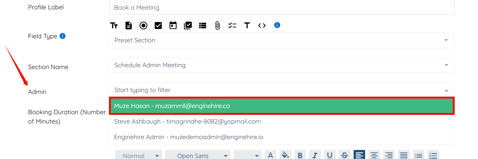 Step 6: Select the admin from the dropdown list for whom you have set availability in the Setting Availability section above.
