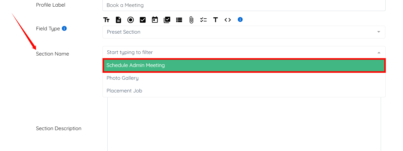 Step 5: In the Section Name field, select Schedule Admin Meeting.