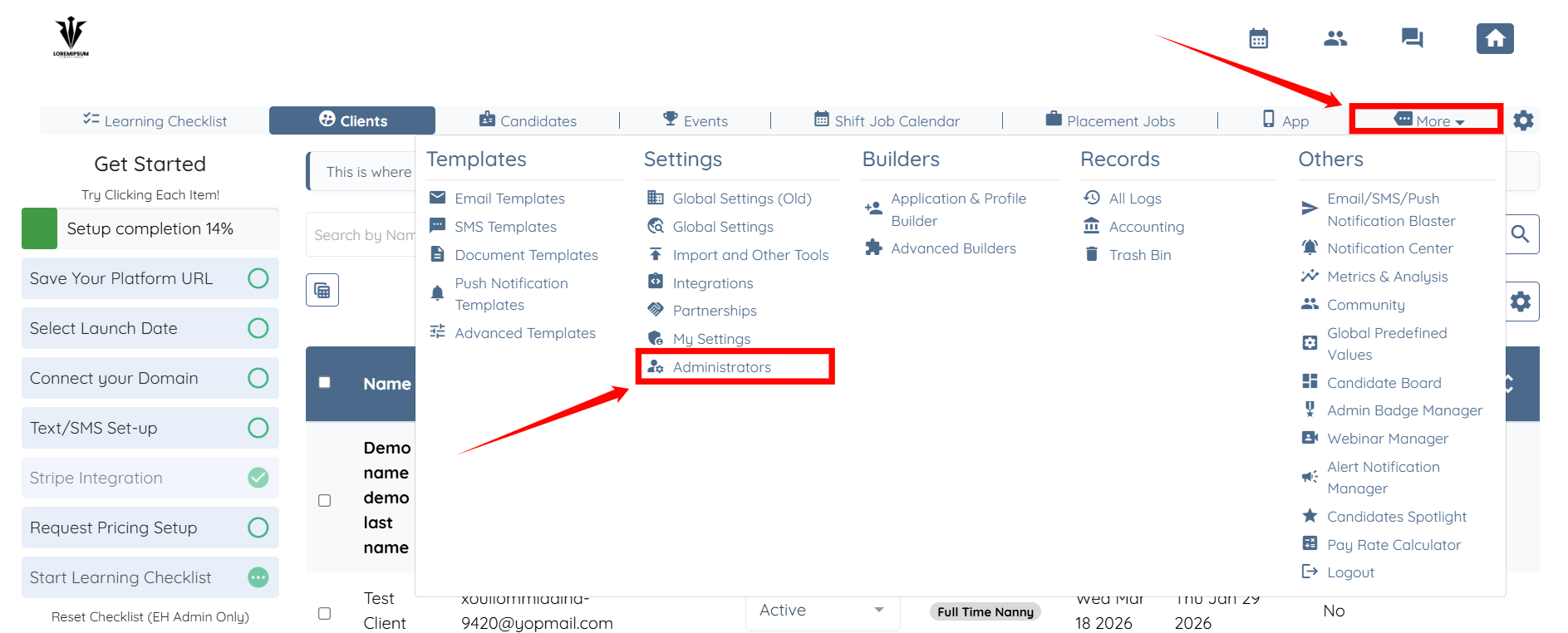 Step 1: Log in to your agent dashboard and click More > Administrators as shown in the screenshot below.