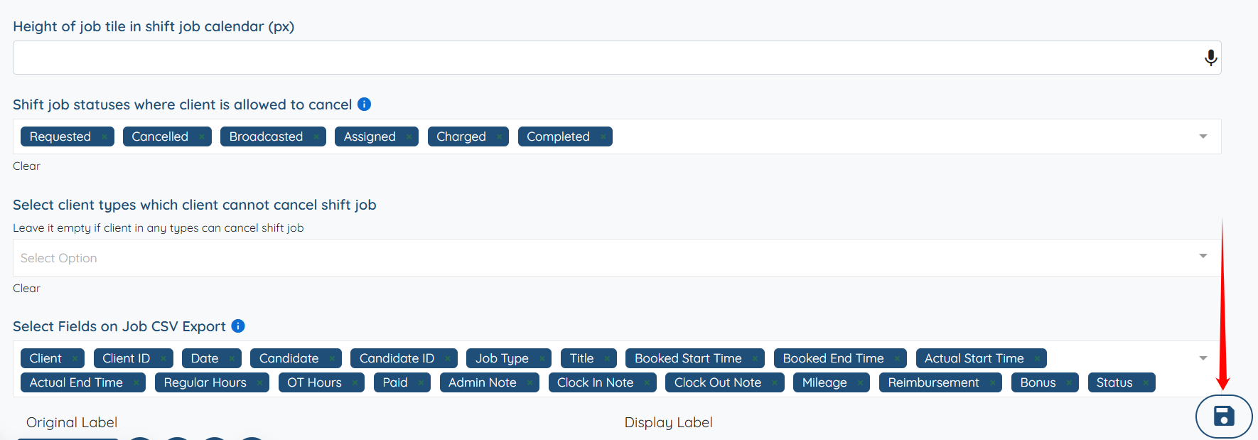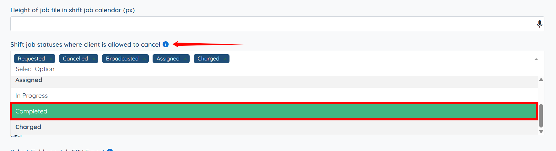 Step 5: Scroll down to the “Shift job statuses where client is allowed to cancel” field and select the job status that allows the client to cancel the job.