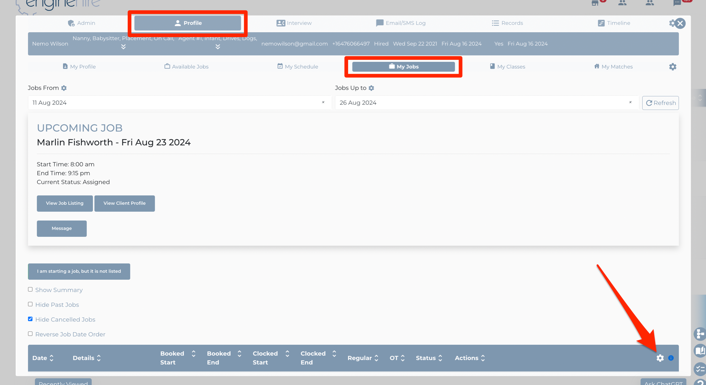 To access the client confirmation on clock out settings, from the admin dashboard click on any candidate (these settings will apply to all candidates, regardless of who you click on), go to the Profile tab, under the profile go to the My Jobs tab and click the gear icon on the table header: