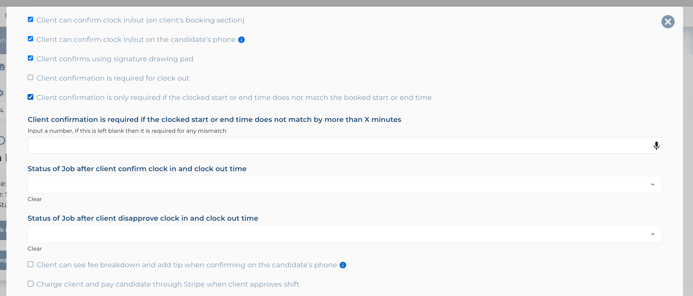 Here you will find various settings to control the experience when a candidate clocks out and the client confirms: