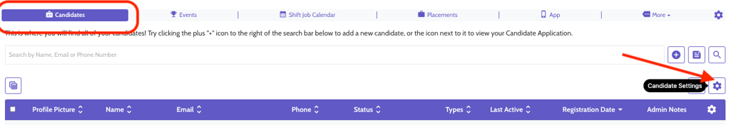 1. Within the Candidates tab of your dashboard, select the gear, to navigate to Candidate Settings