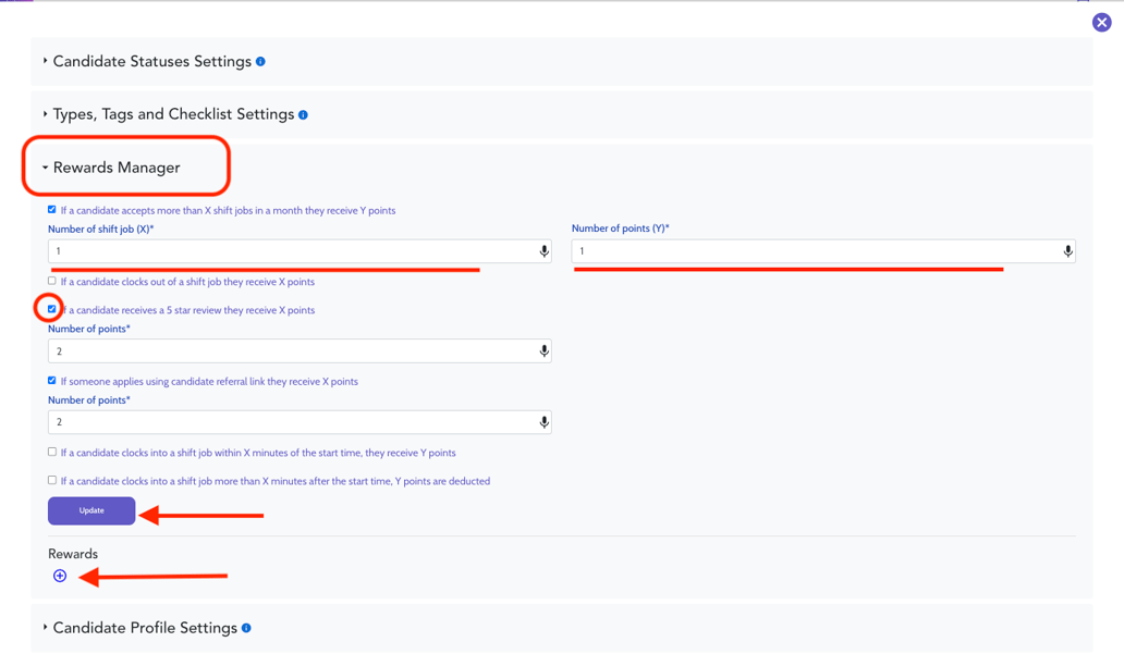 3. Click the checkboxes next to the rewards that you would like to offer and enter the number of points the Candidate will receive for each reward.