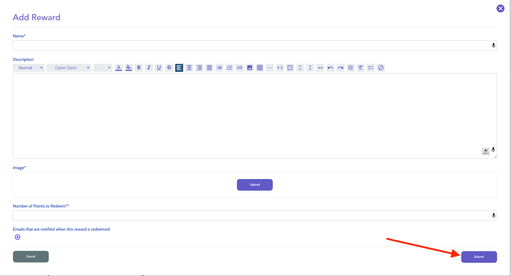 4. Click the "+" icon below Rewards to add in the prize options. Here you can name the reward, input a description, image, number of points needed to redeem this reward, and emails to notify when it's redeemed. Click Submit to save.