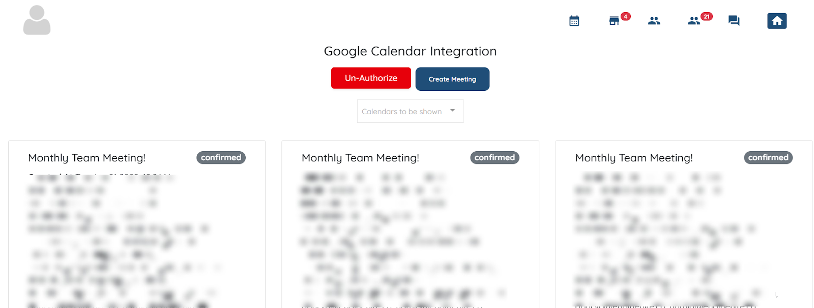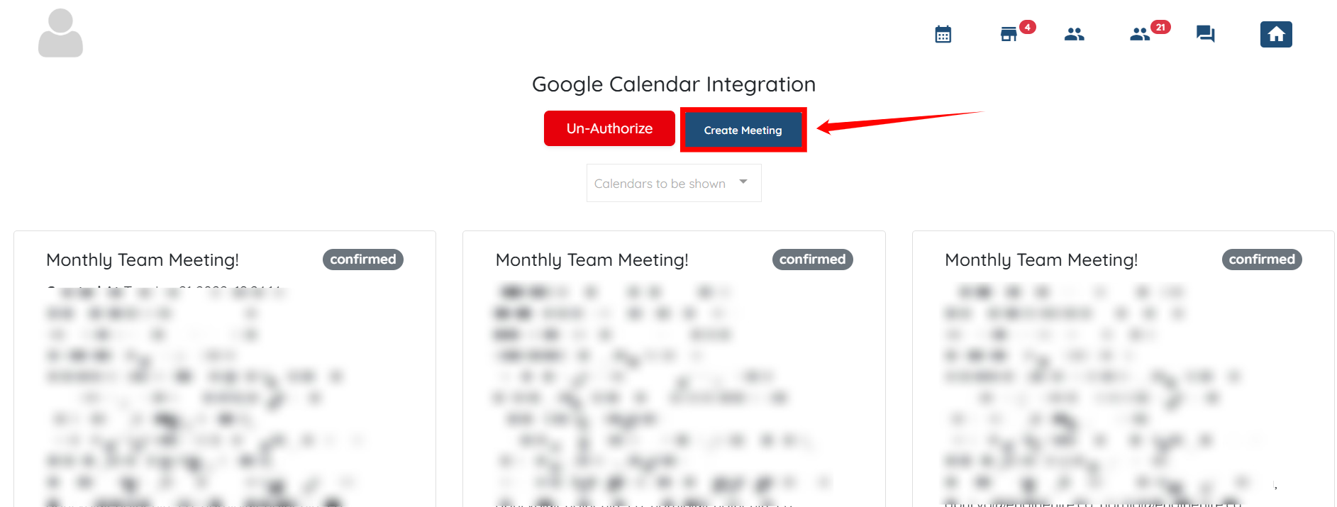 The Google Calendar will be successfully integrated into your agent dashboard, and you can Create a new meeting or Un-Authorize the integration whenever you want.