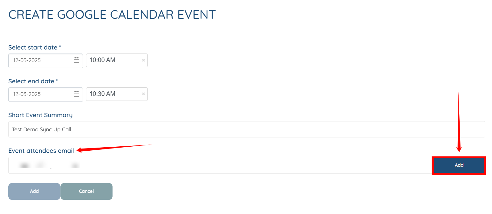 Step 3: Enter the email addresses of the attendees you want to include in your meeting, and then click the Add button to proceed.