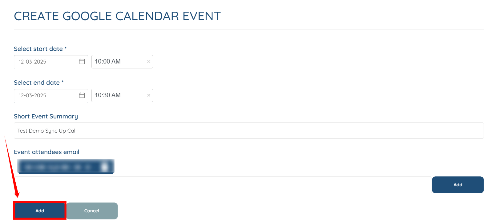 Step 4: After you add all the necessary information, click the Add button, as shown in the screenshot, to send the meeting invite.