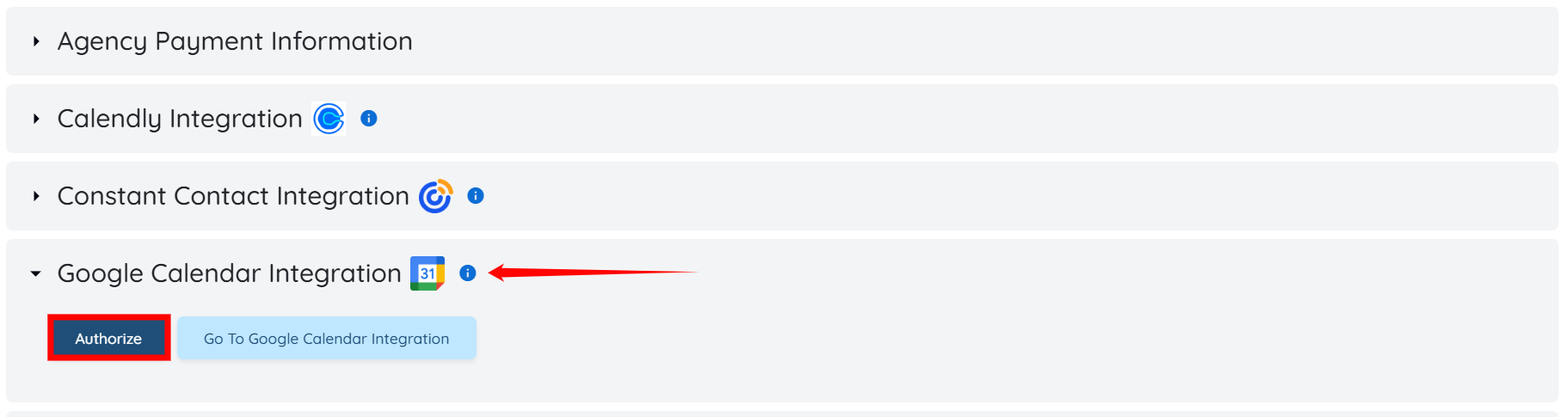 Step 3: Locate and expand the Google Calendar Integration option from the list of available integrations. After that, click on the Authorize button to continue.