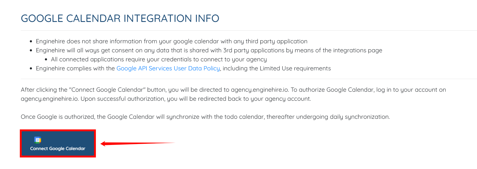 Step 4: Click the Connect Google Calendar button to start integrating Google Calendar into your dashboard.