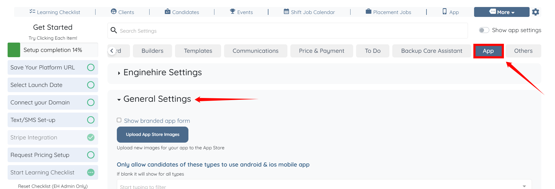 When you are setting up your agency on the Enginehire platform, there are a few app-specific settings you will want to set up before notifying candidates and clients of the offering. Below are descriptions and options for each one.