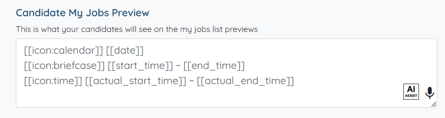 This is what your candidates will view on the My Jobs list preview screen. Customize this view by adding tags and icons from the drop-down menu. Default settings are available if no changes are desired.