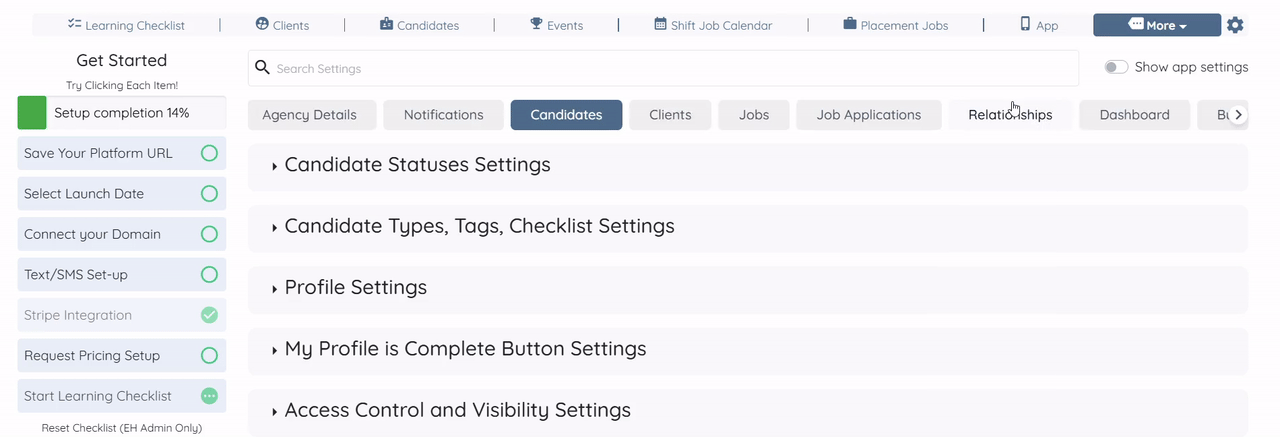 When you are setting up your agency on Enginehire, there are a few app-specific settings you will want to set up before notifying candidates and clients of the offering. Below are descriptions and options for each one.