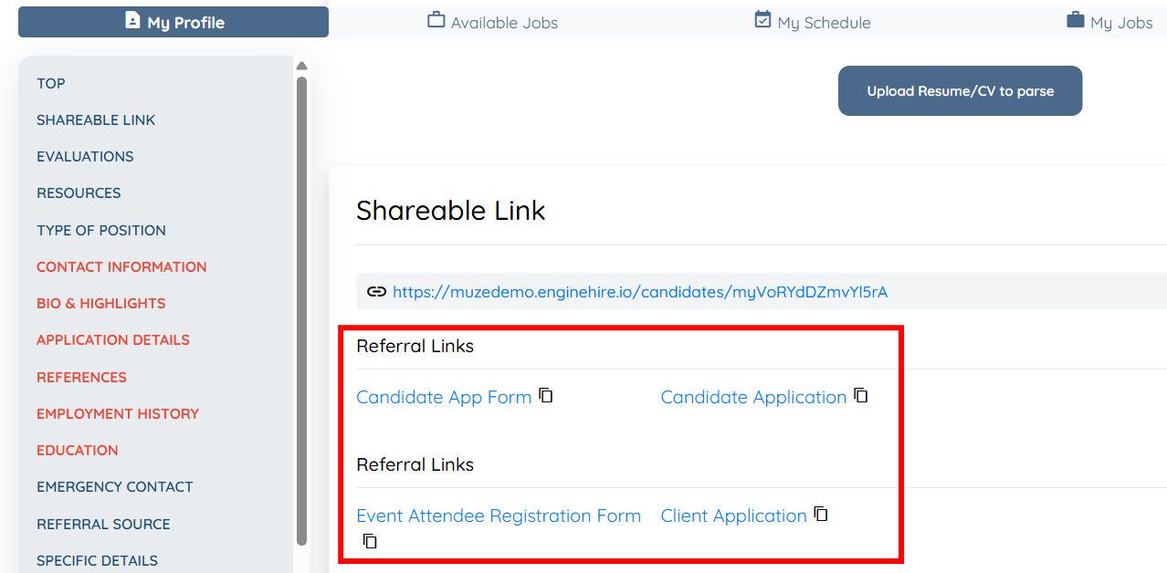 5. View the Referral Link beneath the candidate or client profile link.