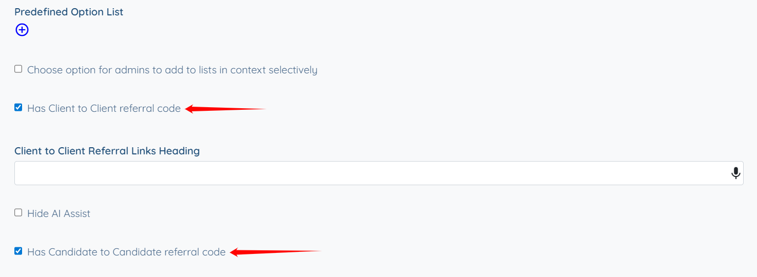 4. Select Has Client to Client Referral Code or Has Candidate to Candidate Referral Code or both.
