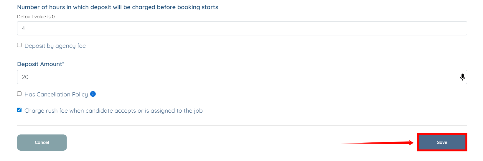 Step 6: Enter the number of hours before the booking starts when the system should charge the deposit. Then enter the Deposit Amount to be charged.