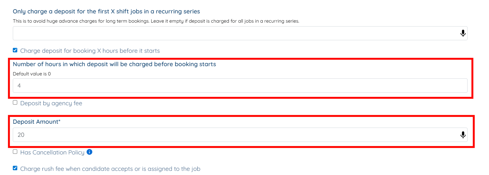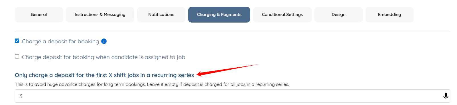 For recurring series of shift jobs you can limit the number of jobs for which the deposit is charged (this is to avoid charging clients a huge amount in advance if they are booking for the long term all at once) by using this setting "Only charge a deposit for the first X shift jobs in a recurring series":