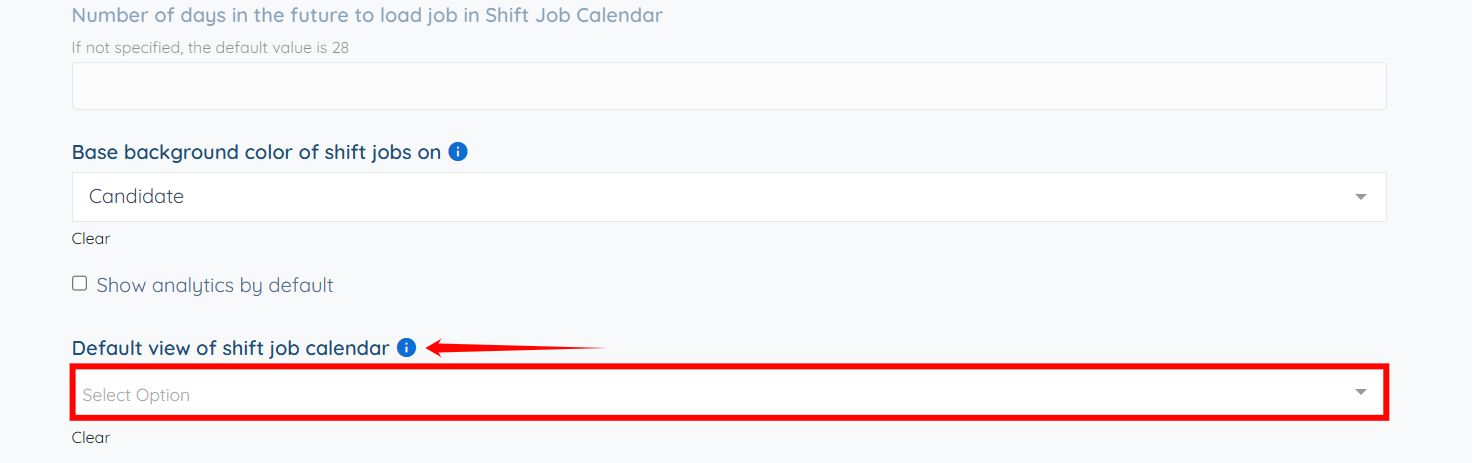 Step 6: Scroll down and locate the Default view of shift job calendar option, then click the box beneath it to activate the dropdown.