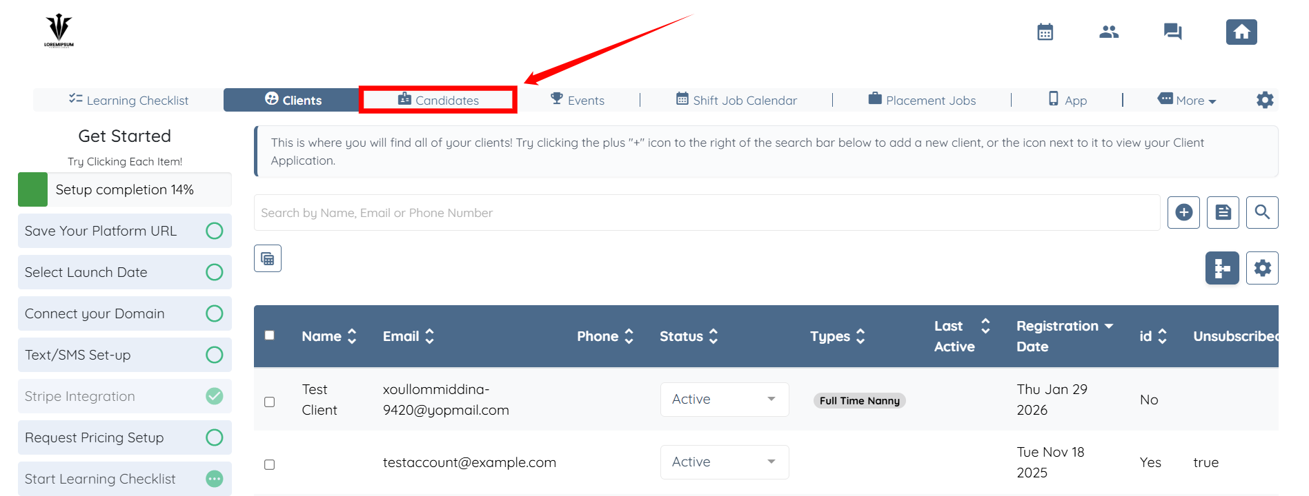 Step 1: Log in to the agent dashboard and click Candidates in the navigation bar.
