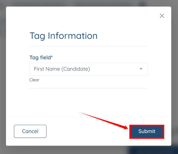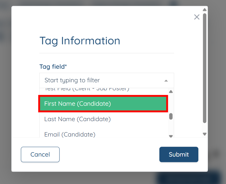 Step 6: Select the tag field you want to add from the dropdown. For example, First Name (Candidate).