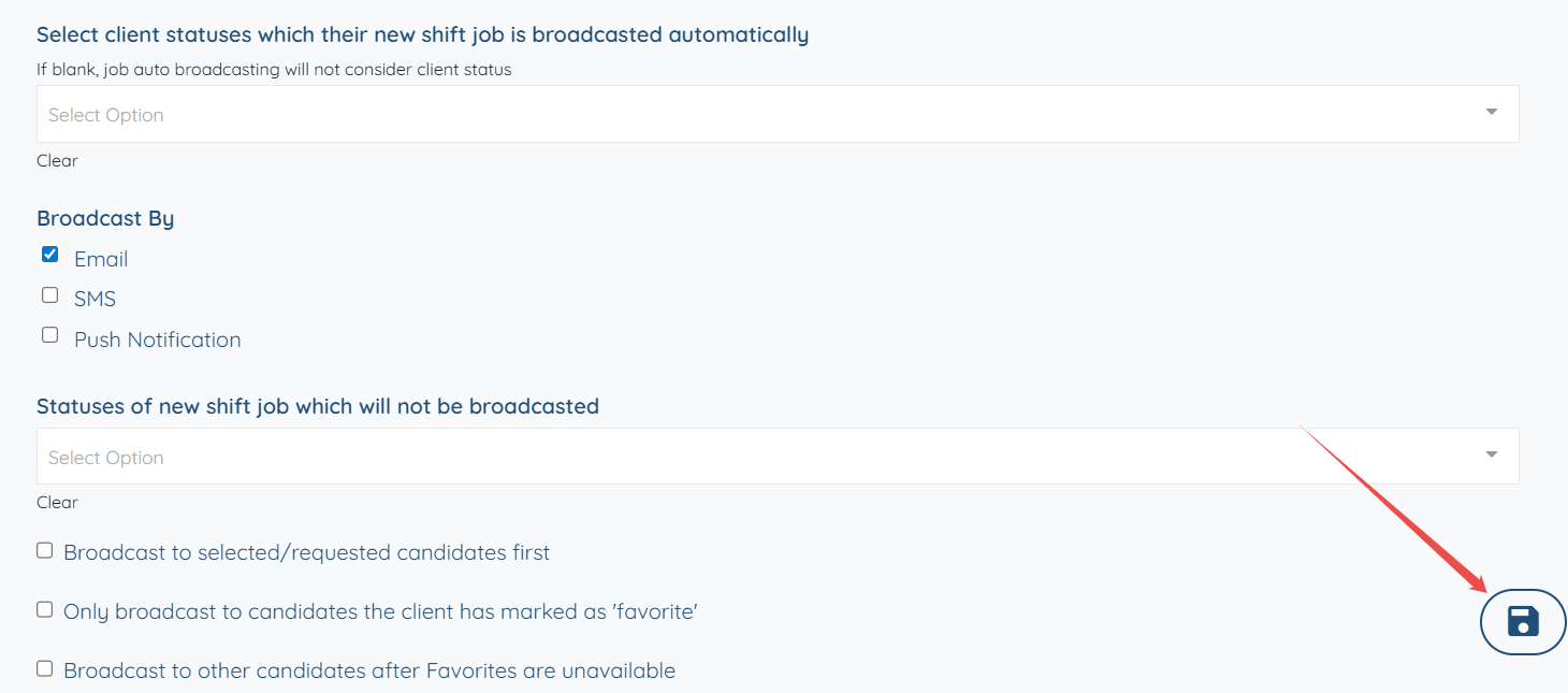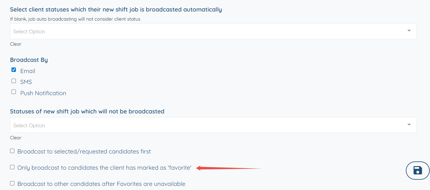 You can further manage the automatic broadcasting according to your preferences. For example, you can select the checkbox labeled Only broadcast to candidates the client has marked as ‘favorite’ to automatically broadcast new bookings only to the candidates the client has marked as favorites.
