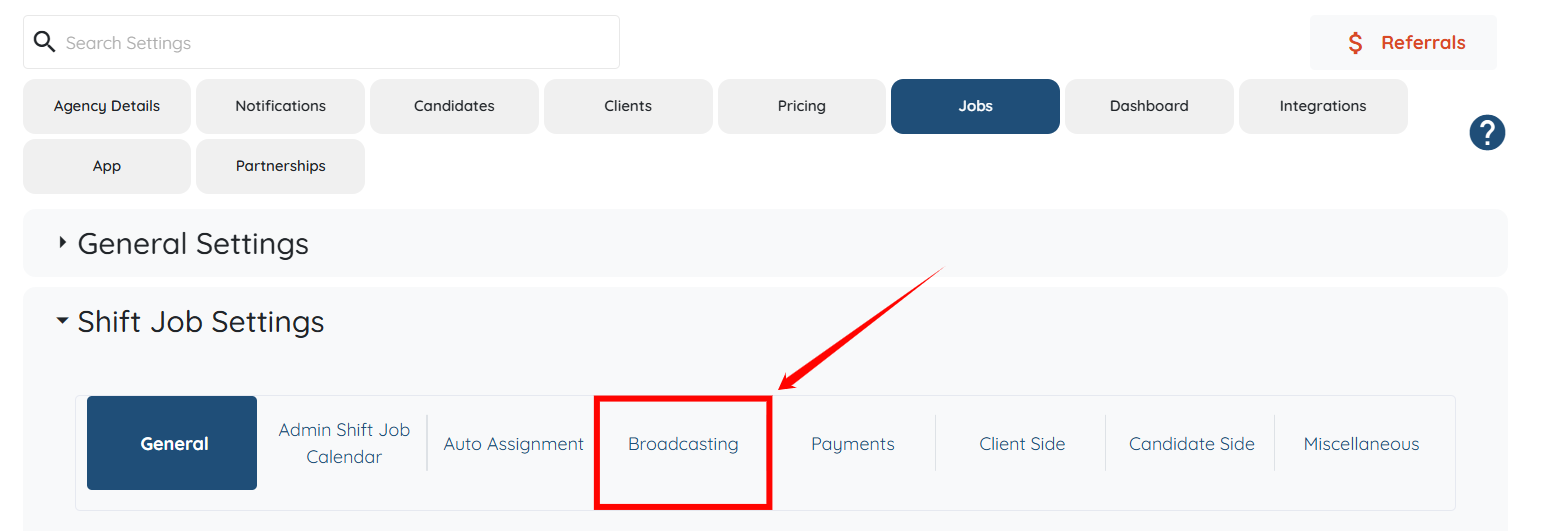 Step 4: Click on the Broadcasting option under the Shift Job Settings.
