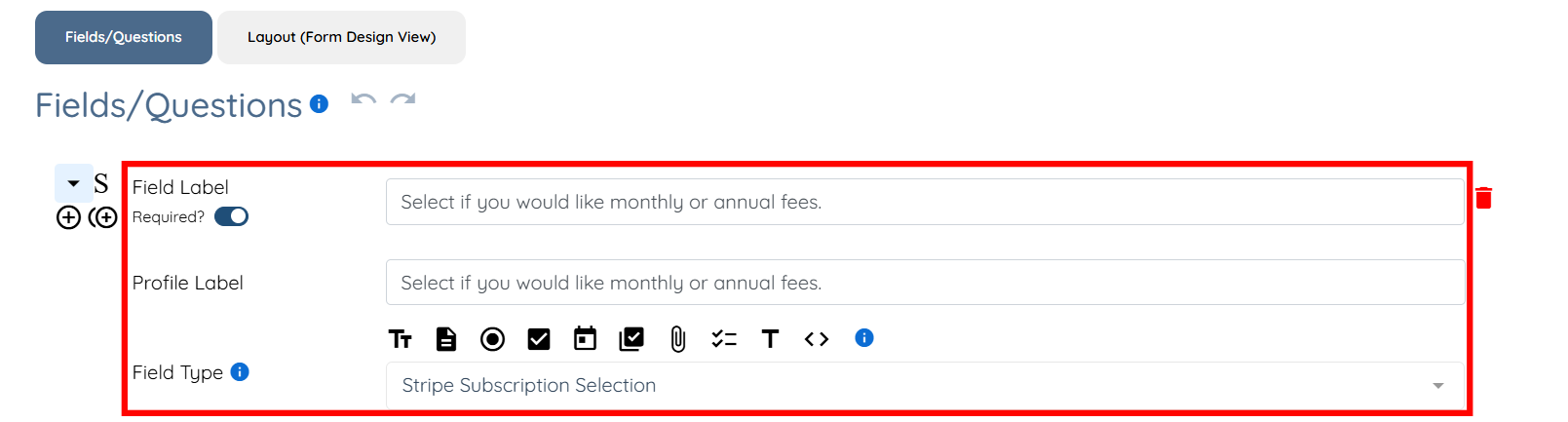 Step 4: Enter the Field Label and Profile Label, then select Stripe Subscription Selection as the Field Type.