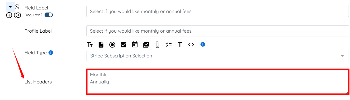 Step 5: In the List Headers field, enter the options you want clients to choose from for recurring charges.