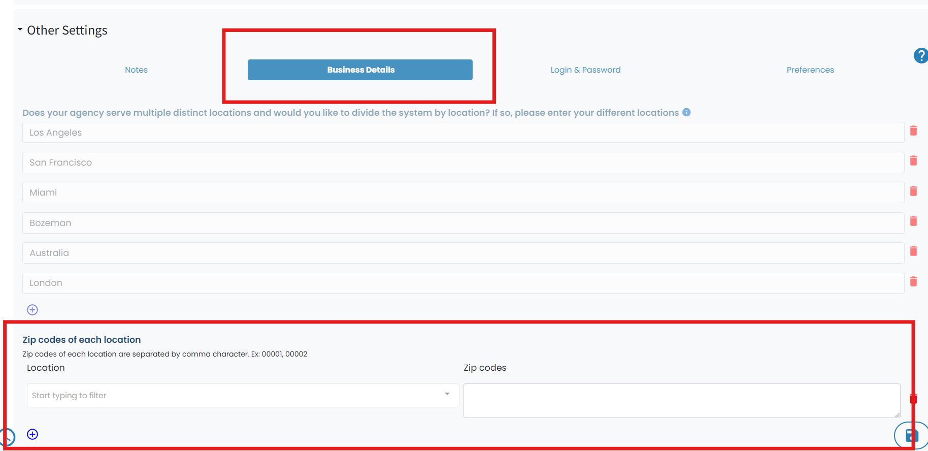 Click on Business Details and select your locations from the drop down and enter in Zip Codes