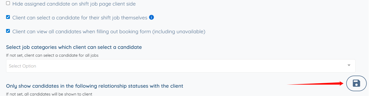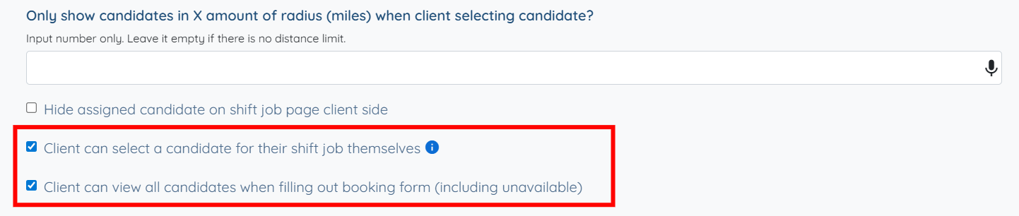 Step 5: Check the Client can select a candidate for their shift job themselves checkbox, and then check the Client can view all candidates when filling out booking form (including unavailable) checkbox.