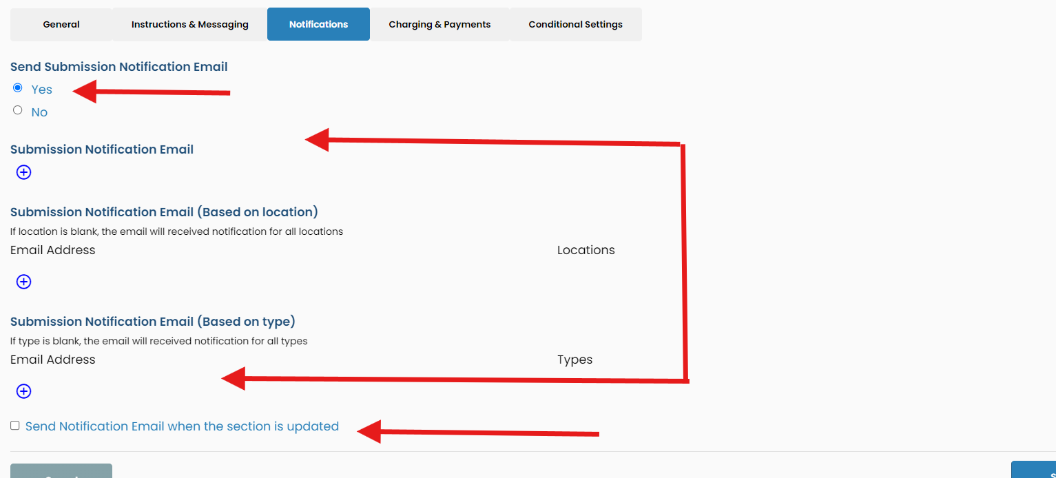 Click Yes and add your email in this area and check off send email when updated. You can set your email to be based on location or types if different staff need to get the notification based on different types or location