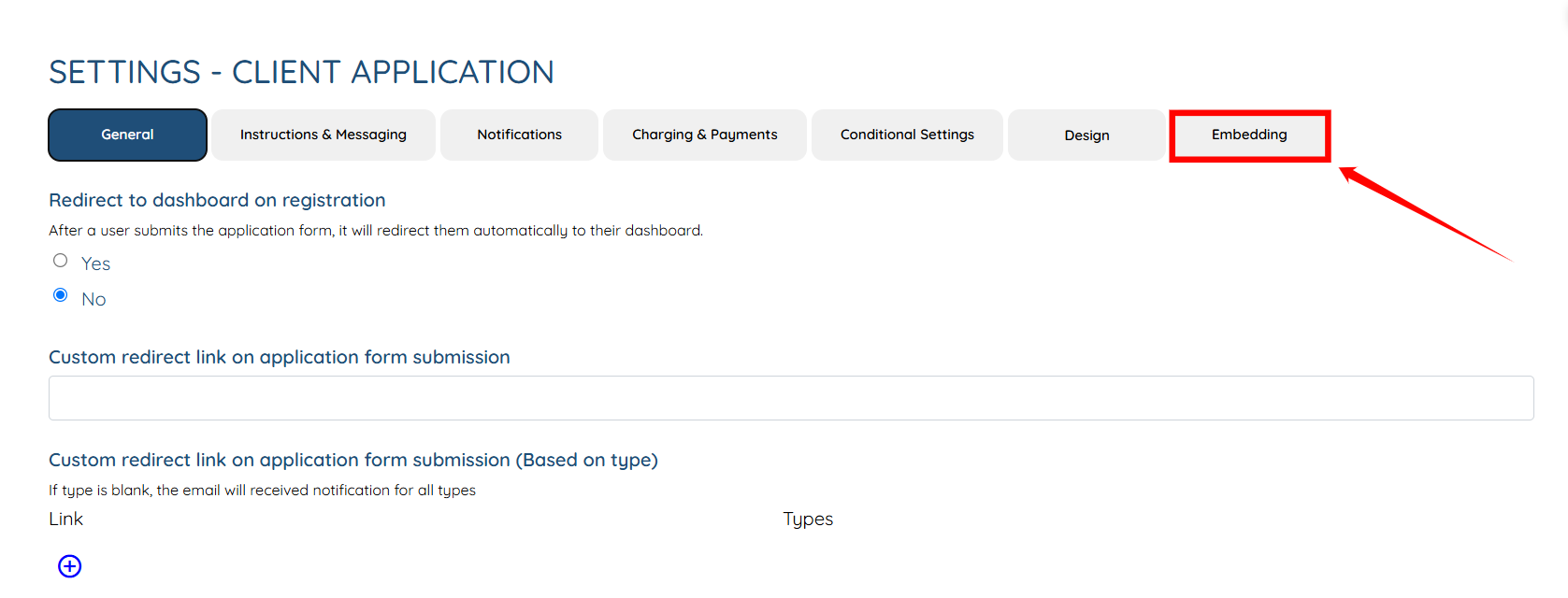 Step 3: A Settings panel will open, displaying various options to modify the application form. Click on the Embedding option located at the end.